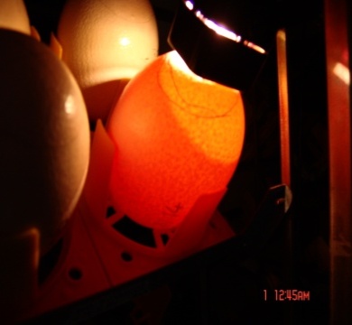 با ورود جوجه به مرحله هچ، کیسه هوایی دستخوش تغییراتی میگردد و فرو رفتگی و برآمدگیهایی در آن نمایان میشود. بهتر است در هر بار کندلینگ که معمولا هر 6 ساعت یکبار انجام میشود، برروی تخم، تحولات کیسه هوایی را با مداد ترسیم نمائید و در هر مرحله، پیشرفت را با مرحله قبل مقایسه نمائید. بتدریج با ادامه روند هچ کیسه هوایی بزرگ شده و جوجه غشا داخلی را پاره نموده و به کیسه هوایی دسترسی پیدا میکند. در این حالت نوک جوجه براحتی در داخل کیسه هوایی نمایان است و با کمی انحراف تخم به حالت افقی، بر پوسته تخم تکیه میزند.این مرحله بسیار حساس بوده و به محض مشاهده، ساعت و تاریخ بر روی تخم یادداشت شود. مطمئن باشید (در شرایط طبیعی و در صورتی که جوجه نرمال باشد) تا 24 ساعت بعد از این واقعه، اتفاقی برای جوجه نخواهد افتاد و حتی نیاز به کندلینگ مجدد این تخمها نمیباشد. در این مدت 24 ساعته چنانچه جوجه تخم را سوراخ ننماید بعنوان یک قائده کلی برای خودتان، میتوانید سوراخ کوچکی (چند میلیمتر) در محل کیسه هوایی ایجاد نمائید و به جوجه اجازه دهید بقیه عملیات را خودش دنبال نماید. اگر بعد از مدت 24 ساعت دیگر جوجه اقدام به خروج ننماید، سوراخ را بزرگتر نموده و بتدریج و طی چند مرحله جوجه را از تخم خارج نمائید.